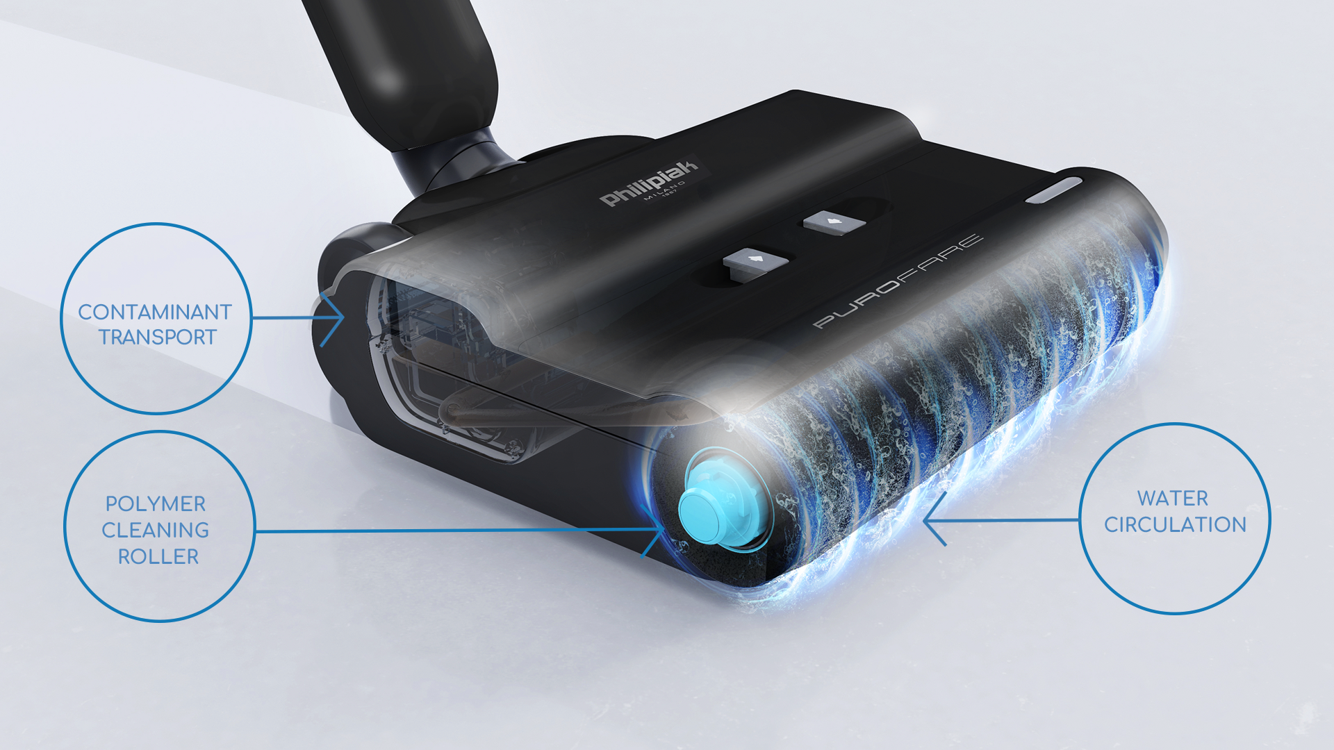 The basis of the bionic water and dust circulation technology is a polymer roll made of high molecular weight material that simultaneously absorbs water and squeezes out dirty water.